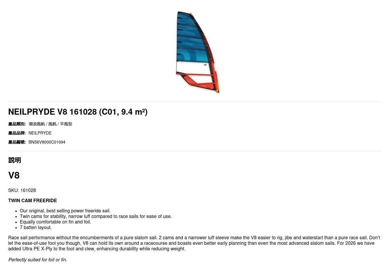 Race sail performance without the encumberments of a pure slalom sail. 2 cams and a narrower luff sleeve make the V8 easier to rig, jibe and waterstart than a pure race sail. Don’t let the ease-of-use fool you though, V8 can hold its own around a racecourse and boasts even better early planning than even the most advanced slalom sails. For 2026 we have added Ultra PE X-Ply to the foot and clew, enhancing durability while reducing weight.