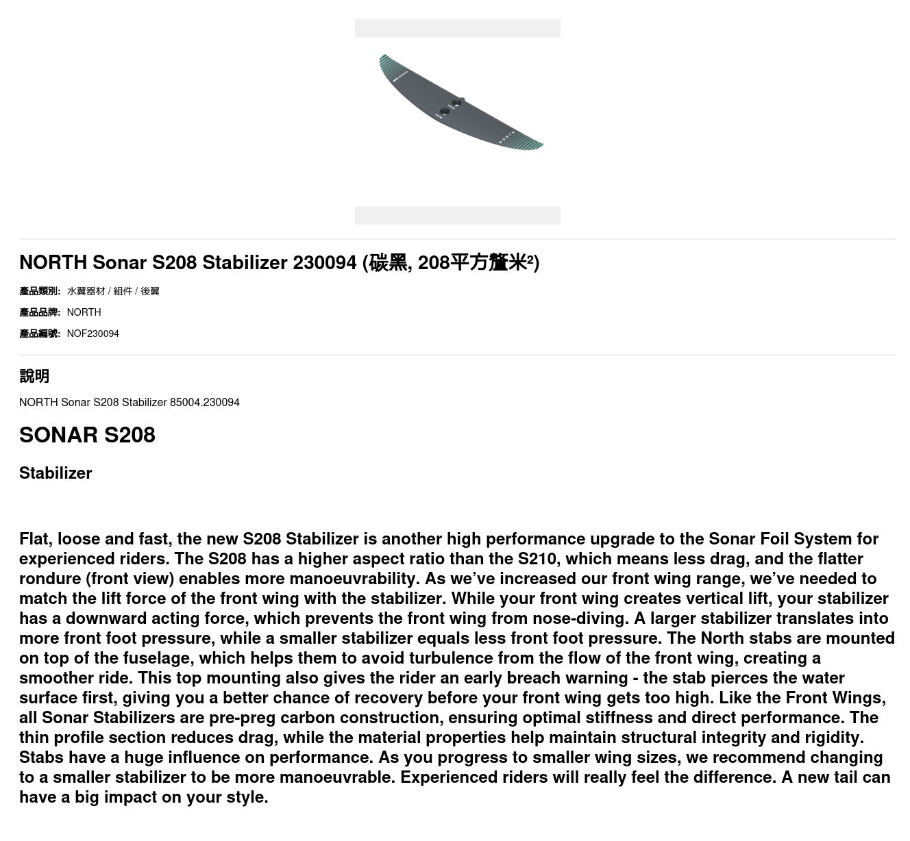 Flat, loose and fast, the new S208 Stabilizer is another high performance upgrade to the Sonar Foil System for experienced riders. The S208 has a higher aspect ratio than the S210, which means less drag, and the flatter rondure (front view) enables more manoeuvrability. As we’ve increased our front wing range, we’ve needed to match the lift force of the front wing with the stabilizer. While your front wing creates vertical lift, your stabilizer has a downward acting force, which prevents the front wing from nose-diving. A larger stabilizer translates into more front foot pressure, while a smaller stabilizer equals less front foot pressure. The North stabs are mounted on top of the fuselage, which helps them to avoid turbulence from the flow of the front wing, creating a smoother ride. This top mounting also gives the rider an early breach warning - the stab pierces the water surface first, giving you a better chance of recovery before your front wing gets too high. Like the Front Wings, all Sonar Stabilizers are pre-preg carbon construction, ensuring optimal stiffness and direct performance. The thin profile section reduces drag, while the material properties help maintain structural integrity and rigidity. Stabs have a huge influence on performance. As you progress to smaller wing sizes, we recommend changing to a smaller stabilizer to be more manoeuvrable. Experienced riders will really feel the difference. A new tail can have a big impact on your style.
