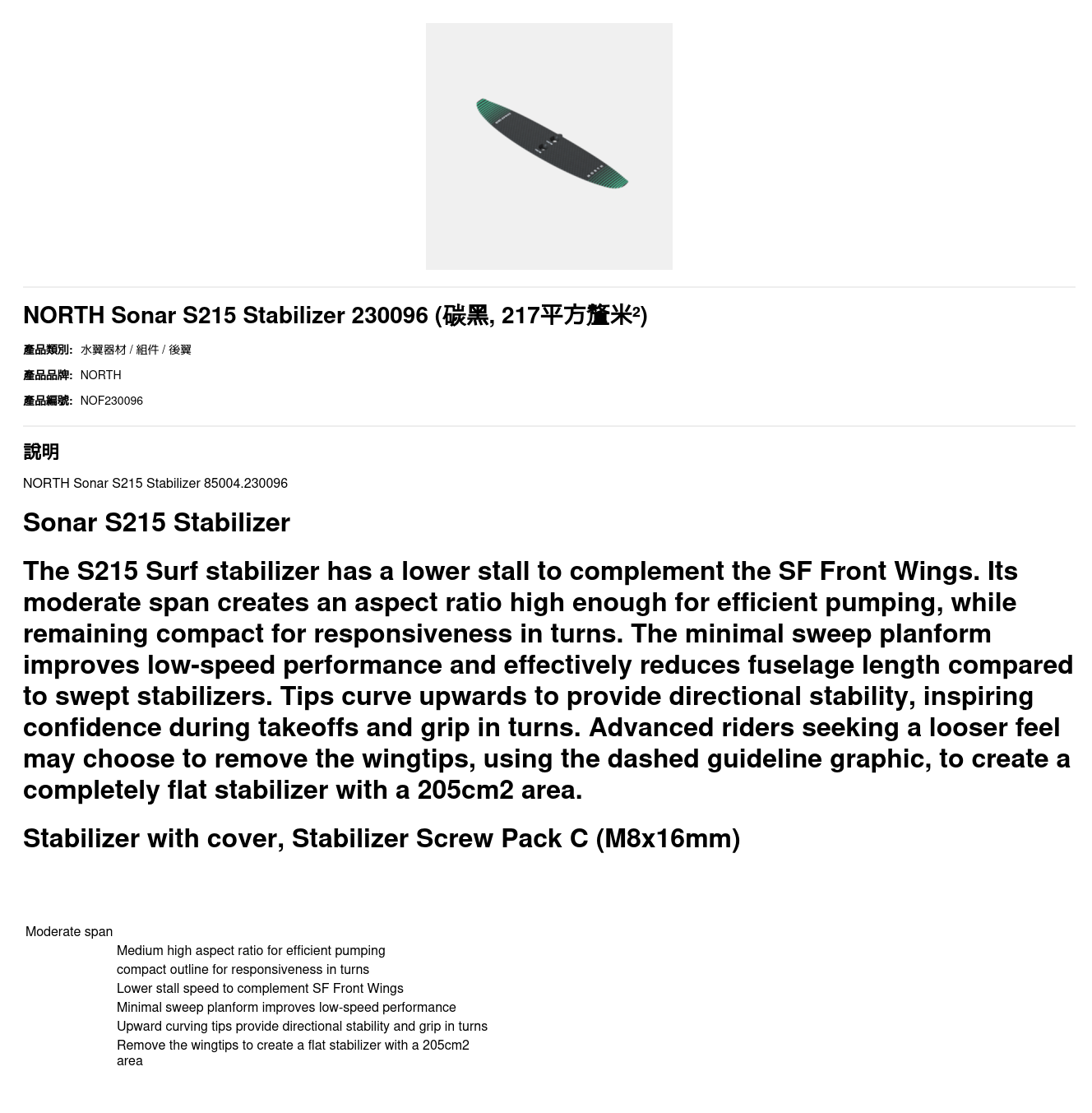 The S215 Surf stabilizer has a lower stall to complement the SF Front Wings. Its moderate span creates an aspect ratio high enough for efficient pumping, while remaining compact for responsiveness in turns. The minimal sweep planform improves low-speed performance and effectively reduces fuselage length compared to swept stabilizers. Tips curve upwards to provide directional stability, inspiring confidence during takeoffs and grip in turns. Advanced riders seeking a looser feel may choose to remove the wingtips, using the dashed guideline graphic, to create a completely flat stabilizer with a 205cm2 area.