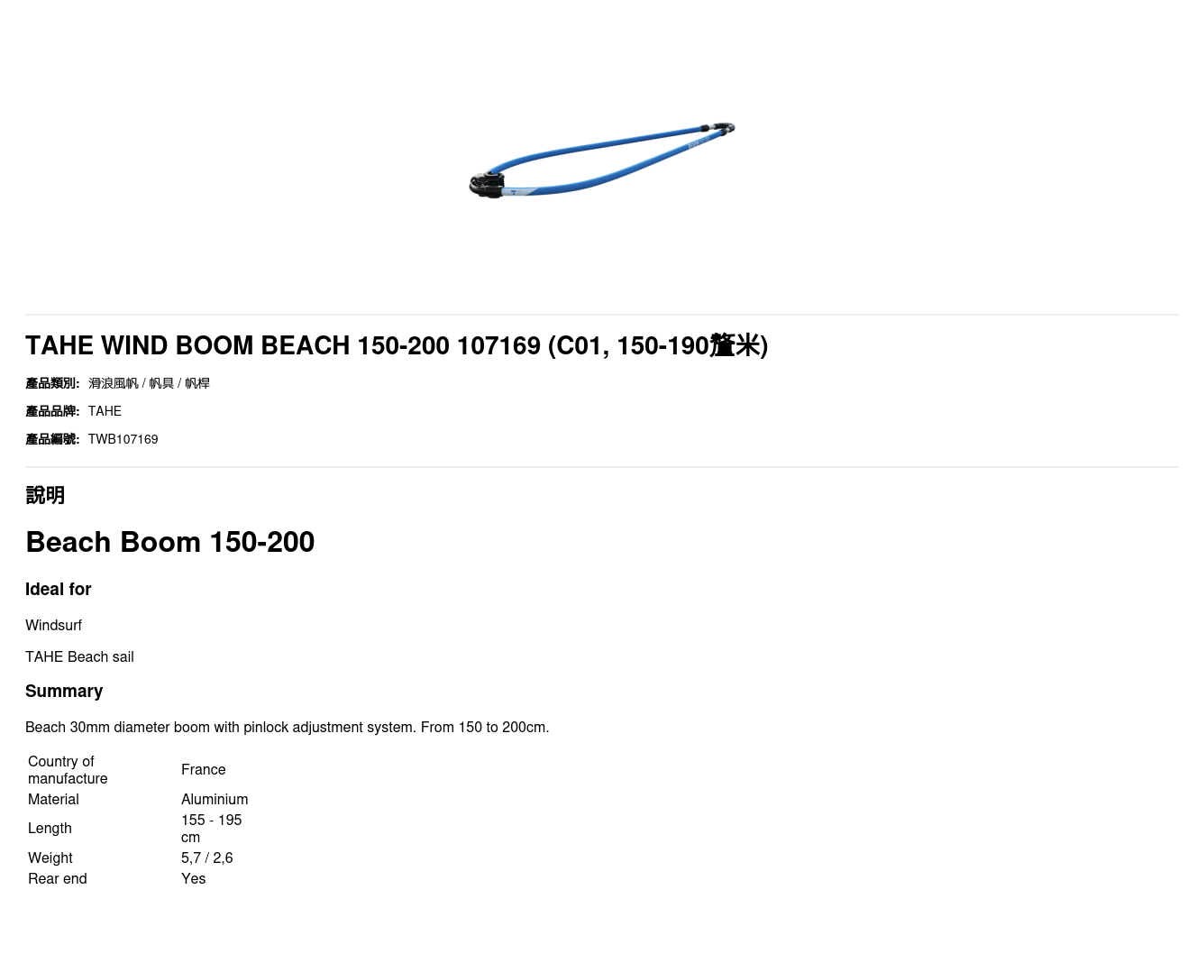 Beach 30mm diameter boom with pinlock adjustment system. From 150 to 200cm.