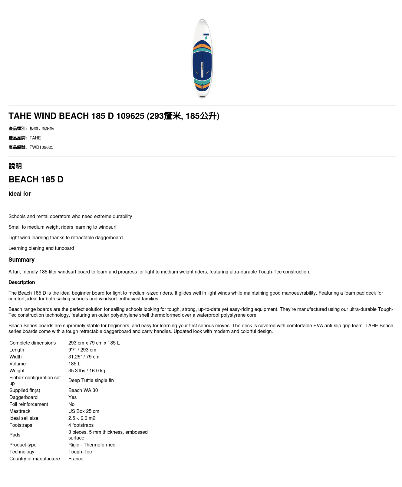 The Beach 185 D is the ideal beginner board for light to medium-sized riders. It glides well in light winds while maintaining good manoeuvrability. Featuring a foam pad deck for comfort, ideal for both sailing schools and windsurf-enthusiast families.