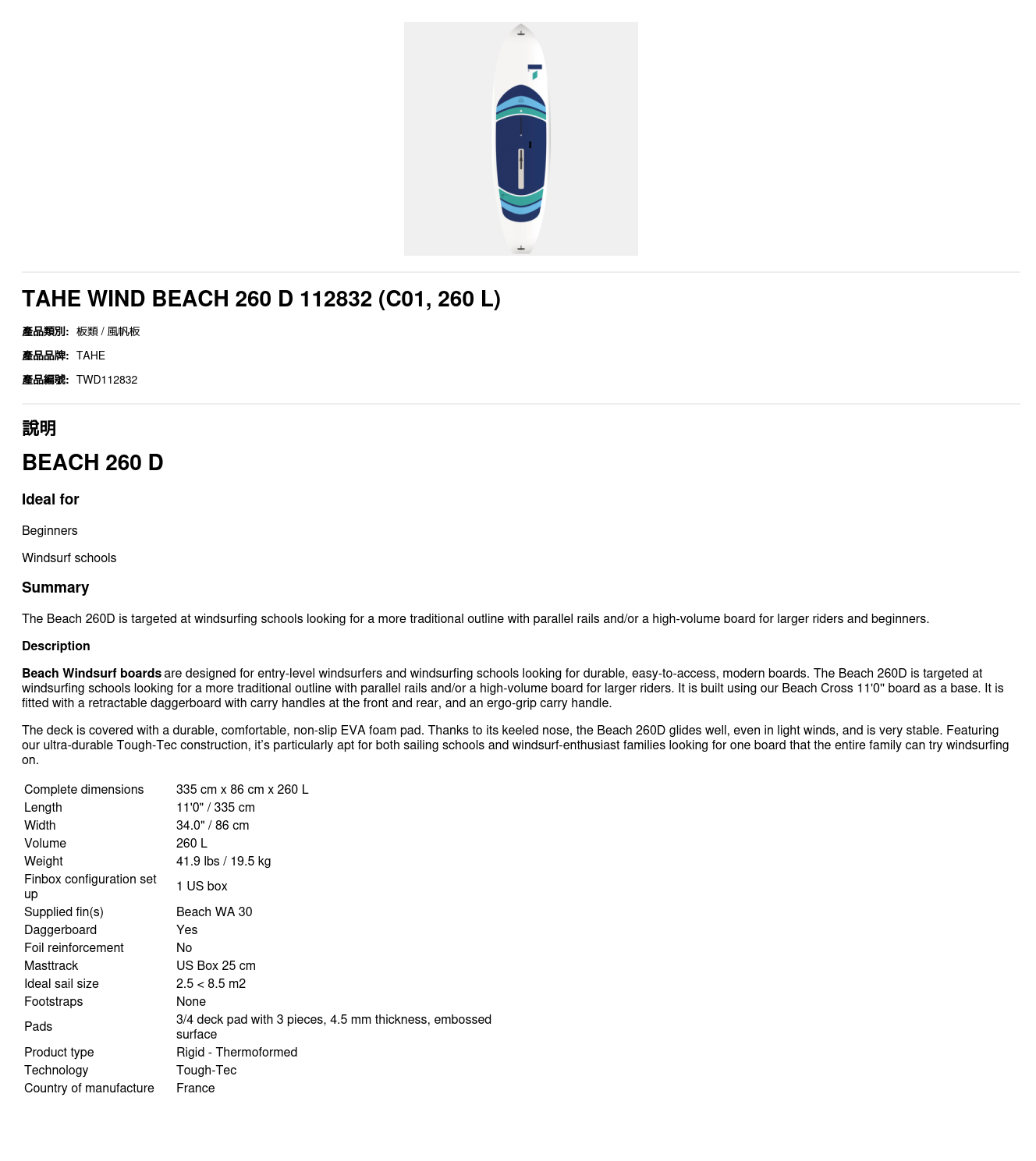 The Beach 260D is targeted at windsurfing schools looking for a more traditional outline with parallel rails and/or a high-volume board for larger riders and beginners.